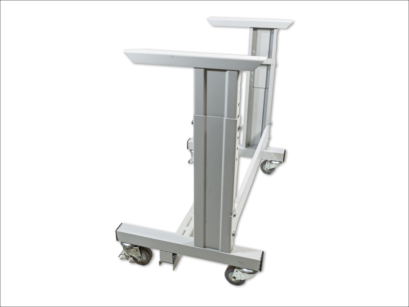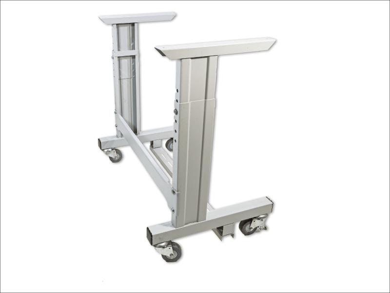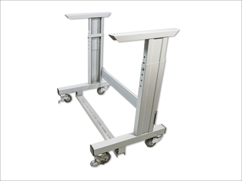 Mesa em “L” com estrutura em aço refoçada com tubos de aço e rodízios industriais indicada para uso com máquinas industriais pesadas.